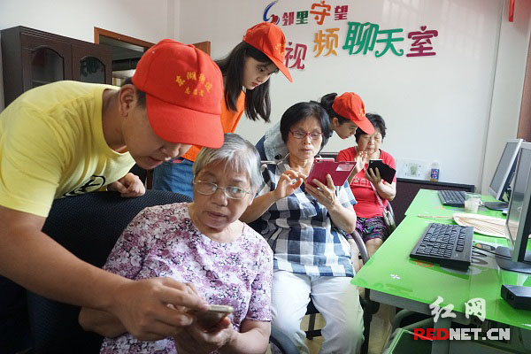 志愿者们正耐心教老人们使用智能手机。图片来源:长沙文明网