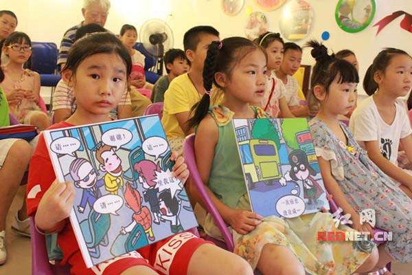孩子们展示“雷锋侠”乐于助人的卡通故事展板。