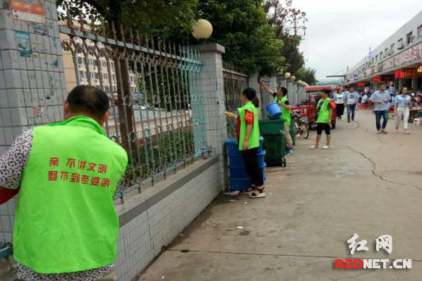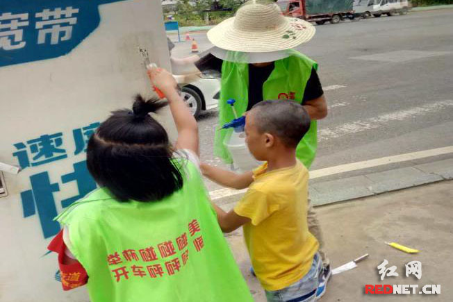 小志愿者在沿街小巷进行“牛皮癣”清理。