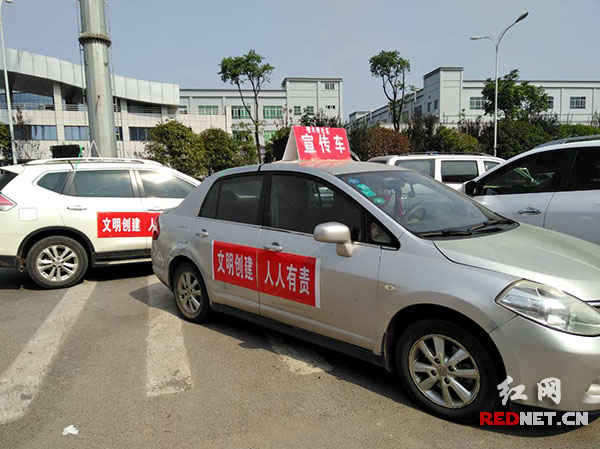 社区干部义务提供的私家车装上小喇叭,贴上宣传标语在蓝思科技、梨江物流园进行流动宣传。