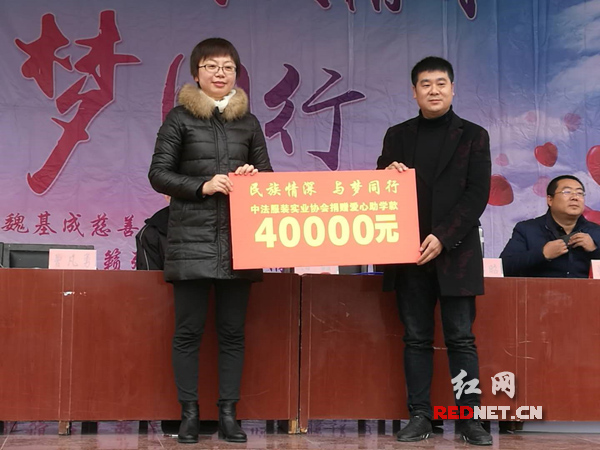 芙蓉区民宗外侨局党组书记阳颖(左)代表芙蓉区民宗外侨局、长沙市民族联谊会芙蓉区分会向龙山县贫困学生捐赠爱心助学金。