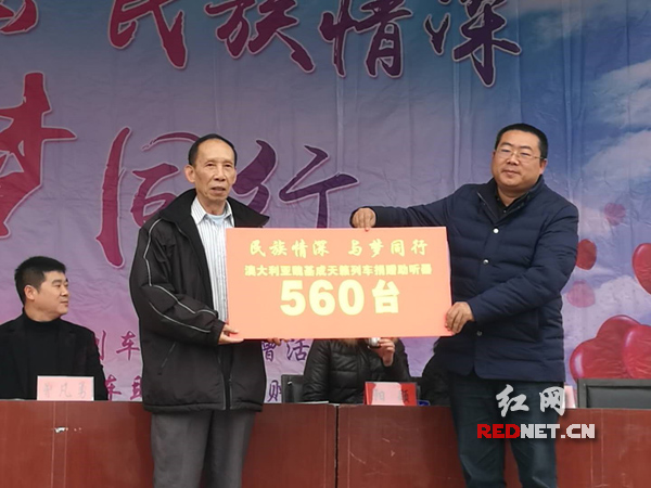 爱心人士黄兆邦先生(左)代表澳大利亚天籁列车慈善机构向龙山县听力障碍人士捐赠助听器。