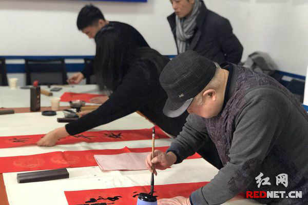 老党员何德祥是桐荫里社区书法协会的老大哥,早在几个月前就张罗着年底的送春联活动,他邀请了四位湖南省老干部诗词协会的老党员,与芙蓉区书法协会成员共同即席挥毫写春联,并现场派赠给居民作为新春贺礼。与市面上售卖的春联极为不同的是,手写的春联充满了四处流溢的墨香,洋溢着笔触红纸的温暖。一条条红纸,展开、铺平、起笔、蘸墨,一字一句地斟酌,这才出来一幅幅传递着喜气与福气的春联。“天飘瑞雪迎春到,地换银装接福来。”“鸡唱凯歌辞旧岁,犬肩使命舞新春。”这些都是何德祥的原创。