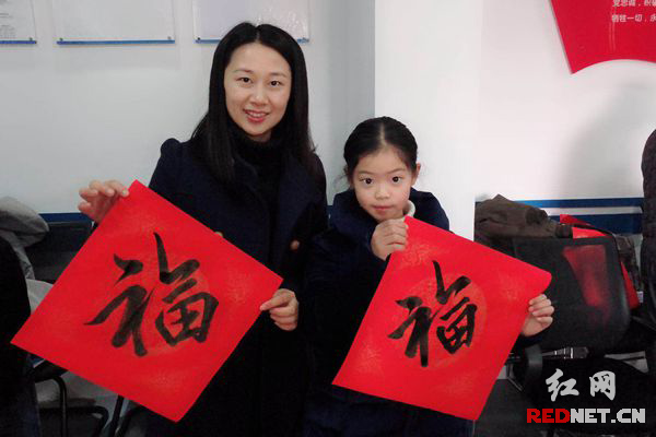 芙蓉区书法协会副主席陈丫欢与“小徒弟”展示所书“福”字。
