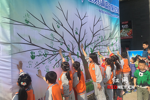 红网时刻长沙3月2日讯(记者 胡芳 通讯员 曾志贤)一棵画有树干的大型彩绘图,吸引小伙伴们纷纷用手掌粘上绿色颜料,在树枝上留下“树叶”,很快树木变得“枝繁叶茂”。3月1日,在长沙市文明办、雨花区文明委、黎托街道体育新城社区等举办的“情系雷锋月,蓝天志愿行”活动现场,青少年志愿者、党员志愿者、居民志愿者等共300余人,变身蓝天卫士,走向街头播“绿”。