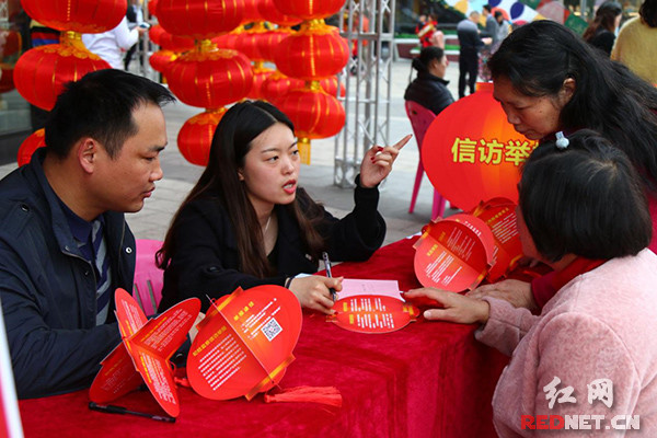 长沙市望城区纪检干部在“元宵喜乐会”现场摆摊设点,接受举报。