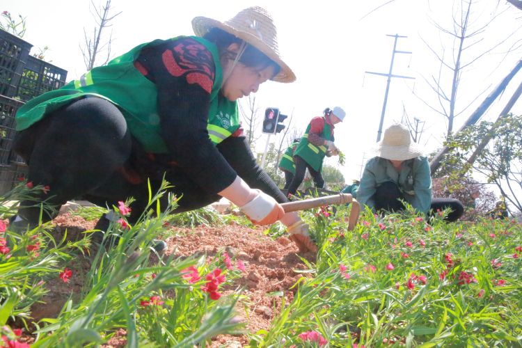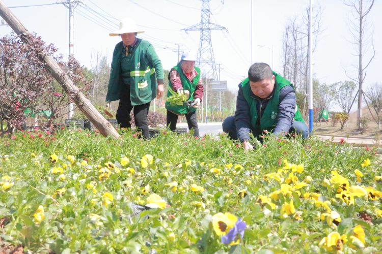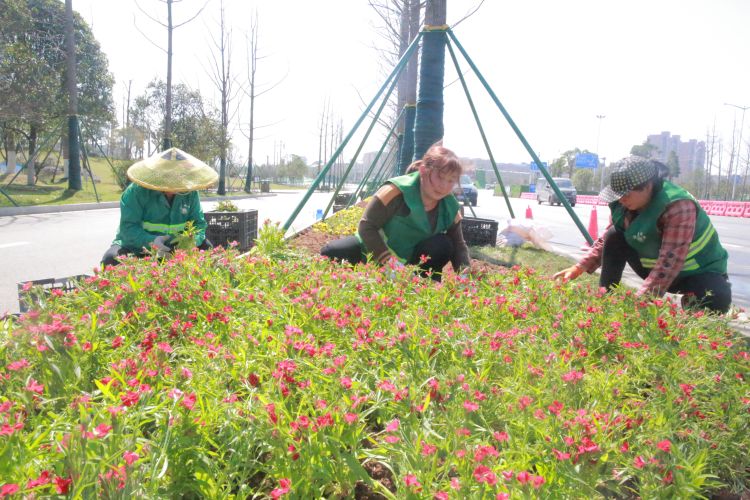 3月10日下午1时许,天气晴好,记者穿行于城区的主要街路和游园广场,随处可见园林工人忙碌的身影,只见她们井然有序地搬运花苗、翻土挖坑、填土浇水,大家分工协作,配合默契,现场一派热火朝天的繁忙景象。