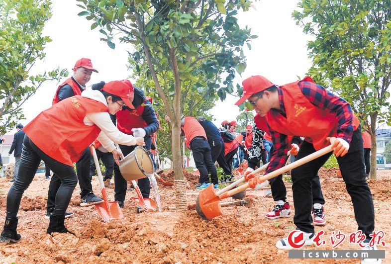 昨日,以“绿色岳麓‘森’呼吸,绿水青山‘林’距离”为主题的植树活动在岳麓区坪塘街道廖月娥敬老院举行。植树现场,岳麓区机关干部、青年志愿者160余人分工合作,挖坑、施肥、扶树苗、填土、浇水……经过近两个小时的劳动,共栽种桃树、金橘树、杨梅树、柚子树、枇杷树等近300株树木。长沙晚报记者 邹麟 摄
