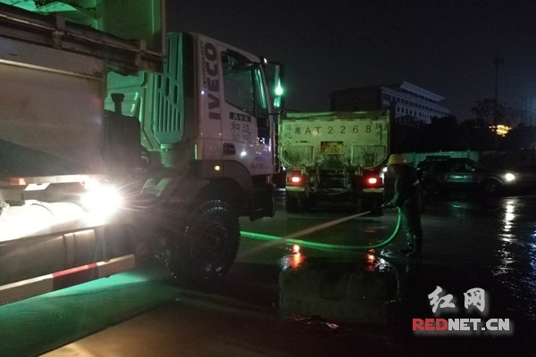整治行动中,执法人员在督促出入工地车辆进行清洗。