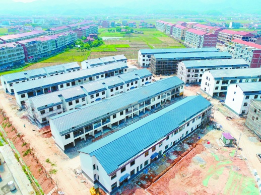 4月10日,新建的宁乡市横市镇灾后安置集居点,粉刷一新的楼房整齐排列。当天,占地面积49亩的宁乡市横市镇灾后安置集居点17栋楼房主体全部完工,内外装饰装修进入扫尾阶段。今年9月,将有84户灾民陆续搬入安置点。湖南日报记者 徐行 摄