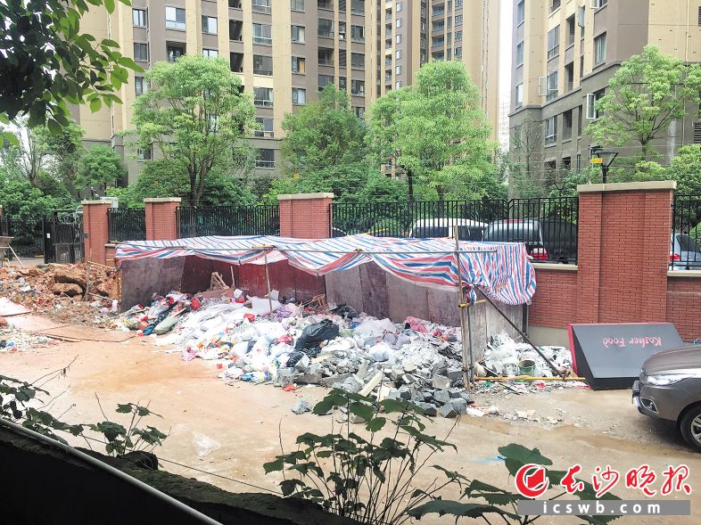 金地格林公馆大量堆积垃圾,一墙之隔的锦湘国际星城1期业主难忍臭味。长沙晚报记者谢春年 摄