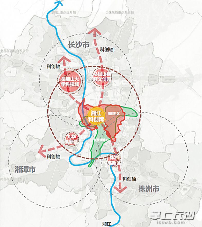在打造“湘江科创湾”方面,长沙规划设计院建议,通过人才引爆新动能,发展战略性科技新兴产业,促进南部“新”区向南部“芯”区转变,打造中西部与湖南的人才智谷;撬动长株潭融城发展,将生态共保放在首位,构建城(服务、居住)、园(产业园)、镇(环生态绿心科创、旅游、康养、体育等系列特色小镇)、村(美丽乡村)的特色空间体系,实现高铁网、城铁网、地铁网、道路网、绿道网“五网一体、三城融合”;长沙南部片区应与湖南湘江新区互动发展,沿湘江东西两岸分别构建“现代服务走廊+创新服务走廊”“山地游+湿地游”“创新转化+创新策源”互补体系。