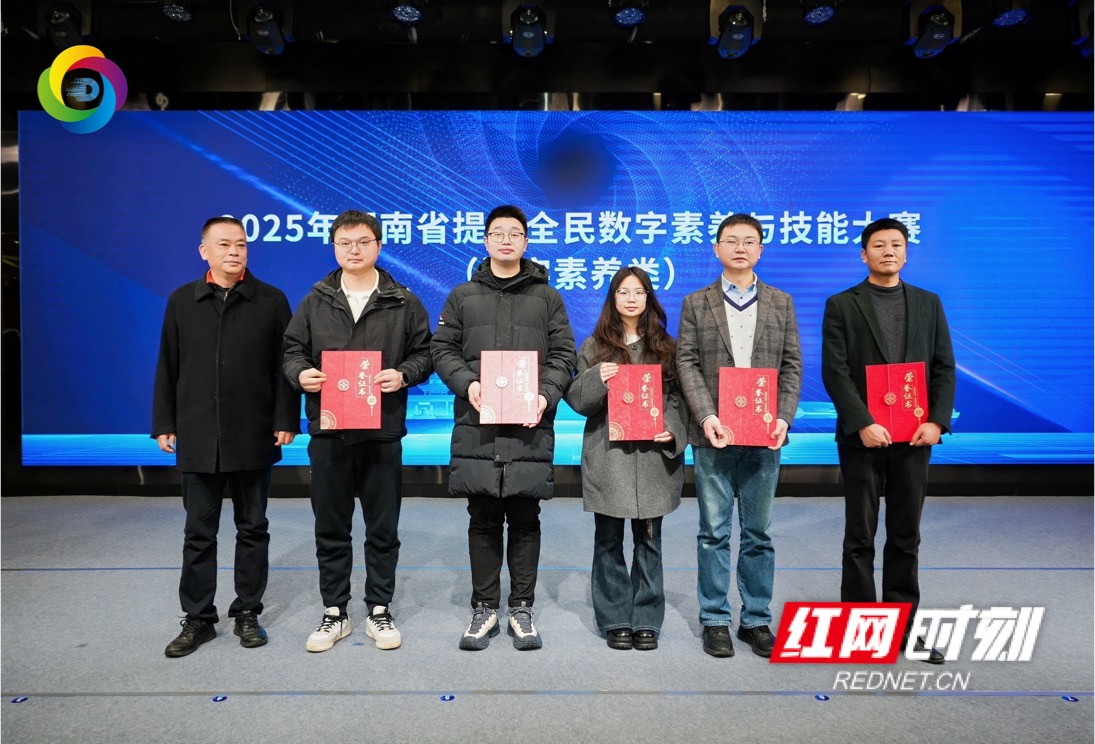 交流会现场,2025年湖南省提升全民数字素养与技能大赛获奖名单正式揭晓。大赛自启动以来,吸引超40万人参与,最终评选出数字素养类与数字技能类百余个奖项,15名获奖代表分批上台接受荣誉。
