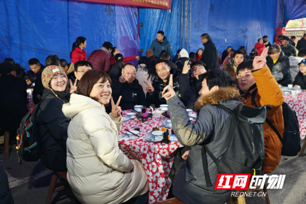傍晚5点,尽管寒风阵阵,但村部广场上搭建起的大棚内篝火熊熊,暖意融融。当天塘里捞起的鲜鱼,加上一头三百多斤的年猪,还有靖港香干、新峰菌子火锅等特色美味,汇聚成了一桌“靖港菜”。现场共备有50多桌宴席,50多名镇村志愿者化身“服务员”,为几百名乡亲和游客端上热菜热汤。饭菜的香味、柴火的噼啪声、交织的谈笑声,共同绘就了一幅党群同心、邻里和睦的温馨画卷。