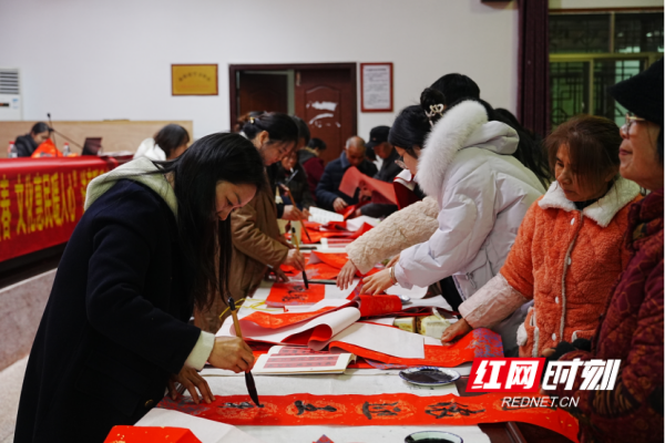 从农产品好物展推区出来后,游客们又聚到了党群服务中心里。这边,区书协的老师正带着大家一起写春联、写“福”字,把美好的新春祝福送到群众家中。全场共送出300余副春联和福字。
