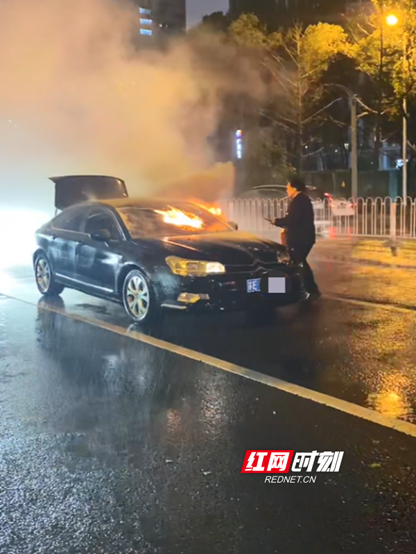当晚11时许,城市已渐入深夜,天空飘着细雨,芙蓉路路段车流依旧不息。长沙公交集团115路驾驶员蔡治正驾驶公交车执行营运任务。突然,前方一幕让他心头一紧——一辆外地牌照私家车正燃起熊熊大火,火苗裹挟着浓烟冲天而起,情况万分危急。