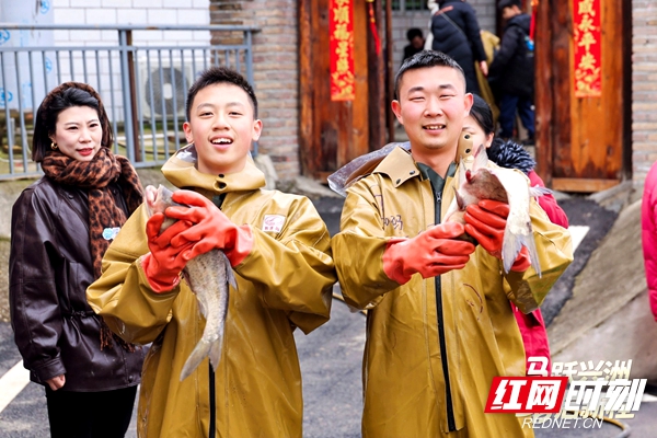 “干塘捉鱼・年年有余”体验区内,游客身着防水装备下塘捉鱼,水中鱼儿穿梭,岸上欢呼不断,大家沉浸式体验乡村民俗野趣,收获 “年年有余” 的美好祝福。