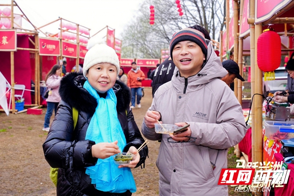 灯塔露营基地主会场,“兴马集市・乡土年味”原生态乡村赶集热闹非凡,“兴马好物”专属标识让本土农产品更具品牌辨识度。糖画、面人、手工打糍粑、传统石磨豆浆等非遗小吃与体验摊位前人气高涨,游客亲手制作、现做现尝,在舌尖品味元宵味道。凭农事体验凭证可享受集市专属优惠,实现体验与消费深度联动,既助力村民增收,也让游客满载而归。