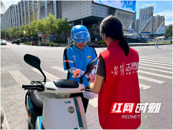“芒小锋”志愿服务队为外卖员送水。