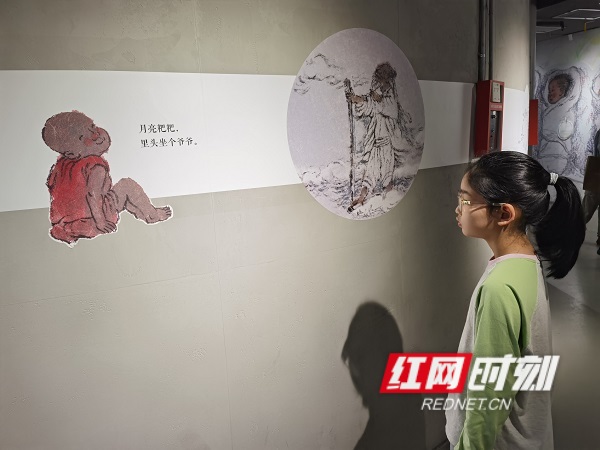 蔡皋创作的绘本插画《月亮粑粑》吸引了小读者驻足欣赏。