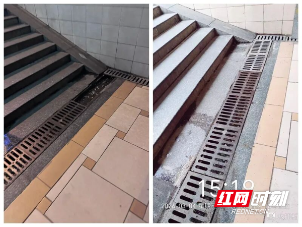 开福区富兴时代广场地下通道,台阶裂了缝,井盖露了洞。市民路过拍了照,顺手@小良。小良回复“收到”的时候是上午,等傍晚市民再经过,台阶平整了,井盖也盖严实了。
