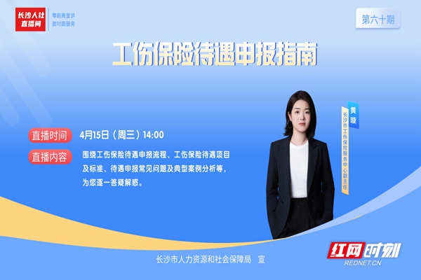 红网时刻新闻4月7日讯(记者 余雅琴)工作中不幸受了伤,如何操作才能确保工伤待遇由工伤基金支付?不同伤残等级能领取哪些待遇?4月15日(周三)下午2点,长沙市人力资源和社会保障局“长沙人社直播间”将推出第60期专题直播,邀请长沙市工伤保险服务中心副主任黄璇,为市民带来一场干货满满的“工伤保险待遇申报指南”政策解读。
