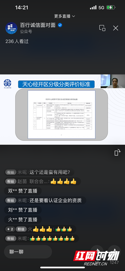 红网时刻新闻6月13日讯(记者 李奕潜 通讯员 刘苗)6月13日,一场以 “天心诚 听我说” 信用品牌为主题的“6・14 信用记录关爱日”线上直播活动,在微信视频号“百行诚信面对面”火热开播。本次天心经开区搭建 “云端课堂”,将信用知识送进企业 “指尖”,吸引园区众多企业代表与社会各界人士踊跃参与,直播间热度持续攀升,掀起一阵诚信学习热潮。