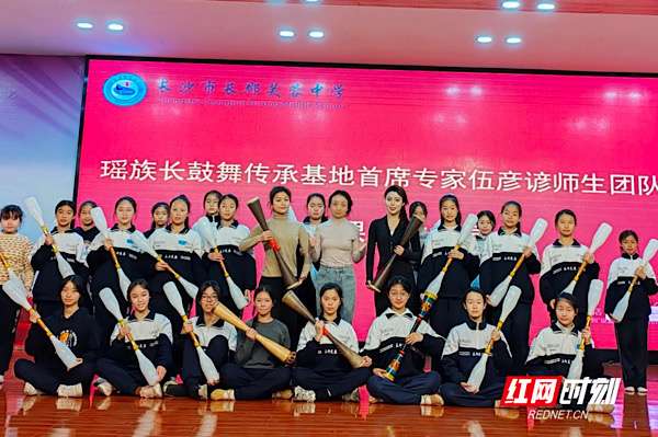 随着瑶族长鼓舞的音乐声在校园内回荡,一场别开生面的文化传承活动在长郡芙蓉中学多功能厅拉开艺术节的帷幕。在老师的带领下,她身后长郡芙蓉中学的学子们手持长鼓,以整齐划一的动作和饱满的热情,将这一古老民族的艺术形式演绎得淋漓尽致,得以近距离接触和了解到这一珍贵的国家级非物质文化遗产。