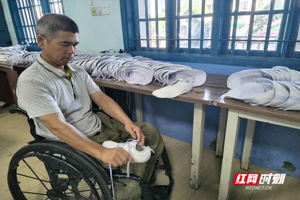 第二天一早,罗老师推着他来到“梦想就业工作坊”。推开门的瞬间,眼前的景象让他足足愣了几秒:几十个和他一样身有残疾的人,正低着头,指尖飞快地专注忙碌,屋里没有沉闷的叹气,只有细碎却有序的声响。罗老师把他推到一张特别的操作台前,声音里带着笑意:“试试这个?”这张台子比普通的矮了一大截,边缘还贴心装了防滑的橡胶条,轮椅一推,便能稳稳当当地滑入。再看桌上,一双崭新的白色运动鞋静静躺着,旁边放着两根泛着光泽的长长的鞋带,像在等着他伸手。