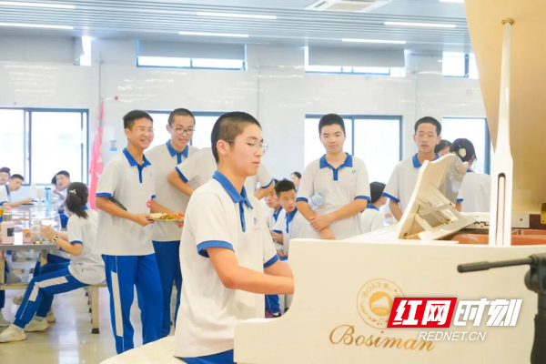 人们常在高档餐厅里边吃饭边听钢琴演奏,而在湖南师大附中小桃园食堂,一架由校友张艺兴捐赠的白色三角钢琴静静安放,多才多艺的学子轮番演奏,用琴声“伴饭”,学习生活也多了一份享受和放松。