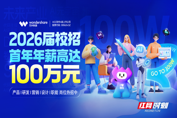 近期,万兴科技还以“湘亲湘AI 兴好有你”为主题,重磅推出“校招生百万年薪”计划,开启2026届全球校招,开放产品、研发、营销、设计及职能五大类岗位,工作地点覆盖长沙、深圳、杭州、日本东京、加拿大温哥华等全球各地,预计发出500个高含金量的Offer,应届生平均年薪可达50万元,研发人才首年年薪最高可达百万,优秀者不设上限。毕业生可通过“万兴科技官网”或关注官方公众号“万兴人”了解更多信息或投递简历。