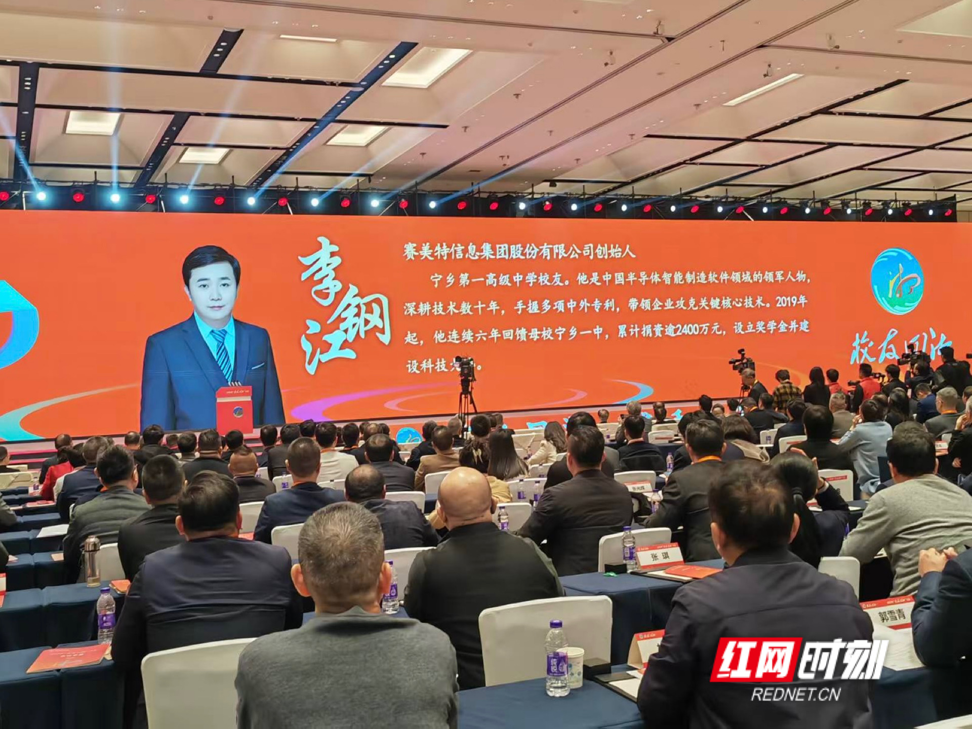 本次大会还设立了“突出贡献人物”和“招引大使”两项荣誉。宁乡一中校友、赛美特信息集团股份有限公司创始人、董事长兼CEO李钢江凭借对湖南教育事业的长期投入、对区域产业人才培养的持续赋能,被授予“突出贡献人物”称号。